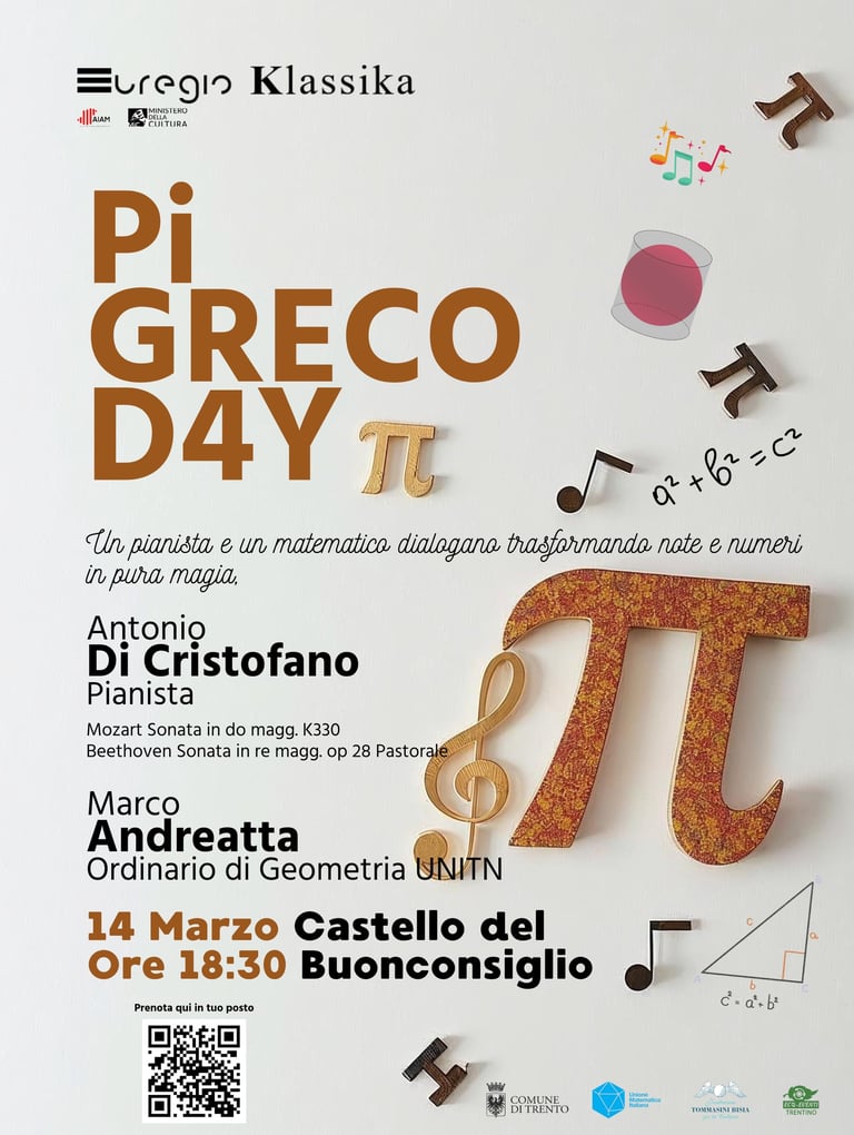 14 Marzo Castello del Buonconsiglio Ore 18.30 Pi Greco day. Marco Andreatta matematico e Antonio di Cristofano pianista Un pianista e un matematico dialogano trasformando note e numeri in pura magia,
