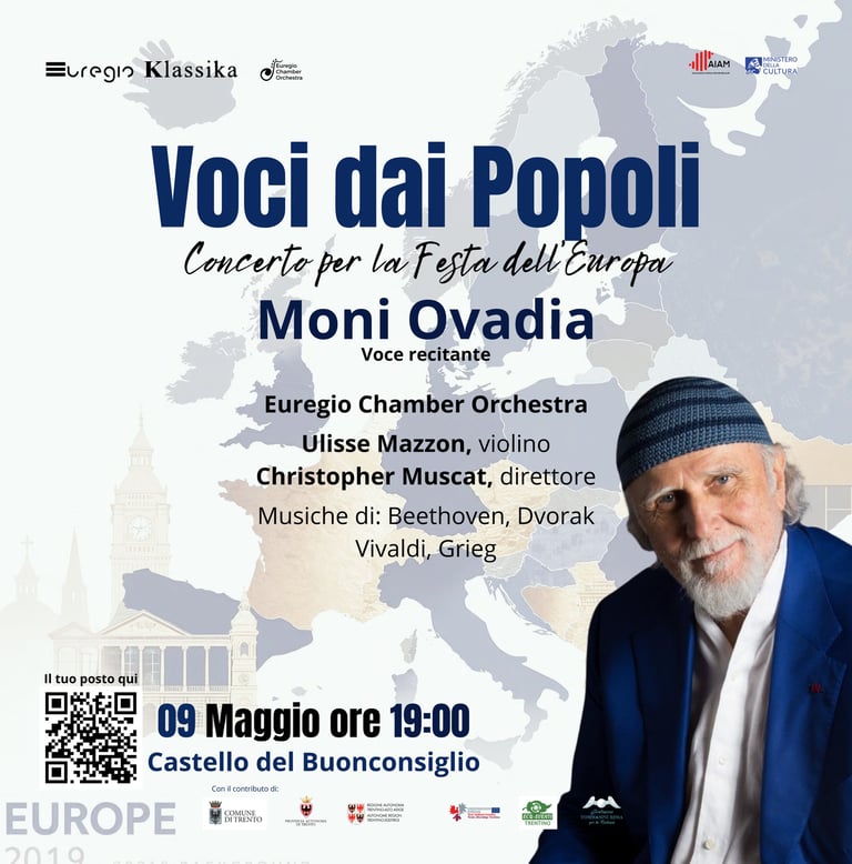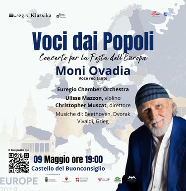 09 Maggio Voci dai Popoli Moni Ovadia, Euregio Chamber Orchestra, Christopher Muscat, Ulisse Mazzon ore 19:00 Castello del Buonconsiglio, Trento