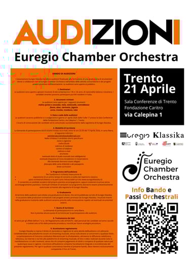 L’associazione Euregio Klassika bandisce audizioni finalizzate alla formazione di una graduatoria di strumentisti idonei a collaborare con la Euregio Chamber Orchestra nell’ambito delle attività concertistiche e dei progetti artistici promossi dall’associazione.